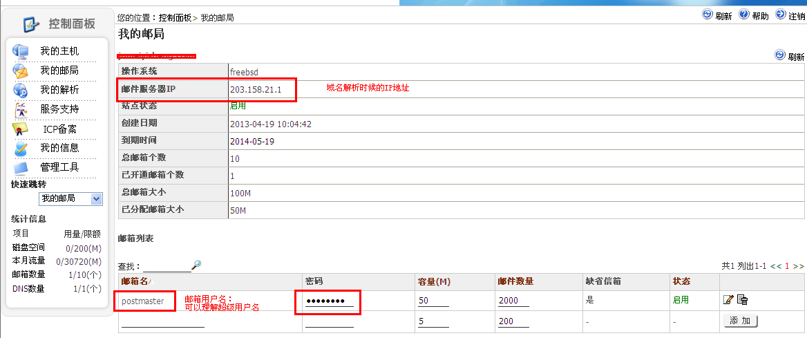 1.郵箱的詳情敬請參照各自的空間,進(jìn)入空間控制面板可以看到對應(yīng)的郵局
