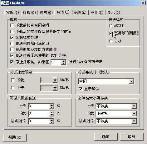 2.如果你采用的是Flashfxp來上傳系統,請參照下圖進行設置:選項-參數設置-傳送-二進制 如圖所示